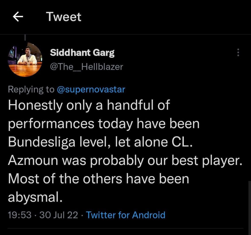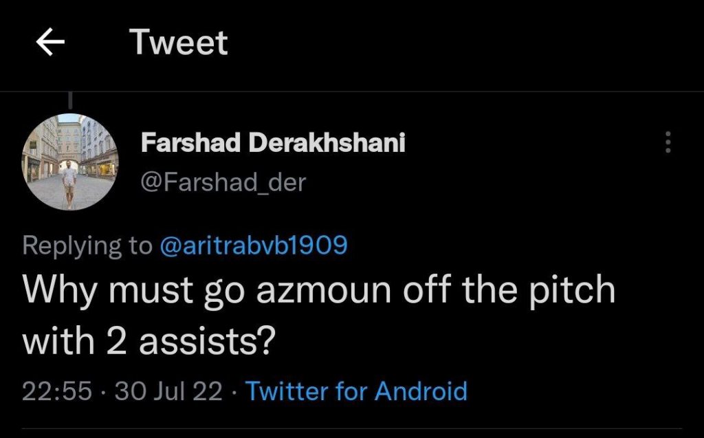 آزمون که در ۴۵ دقیقه ابتدایی یک بار نیز تیر دروازه الورسبرگ را به لرزه درآورده بود، انگیزه زیادی برای گلزنی در نیمه دوم داشت اما با تصمیم دور از انتظار سرمربی تیم، او ادامه بازی را از روی نیمکت به نظاره نشست.