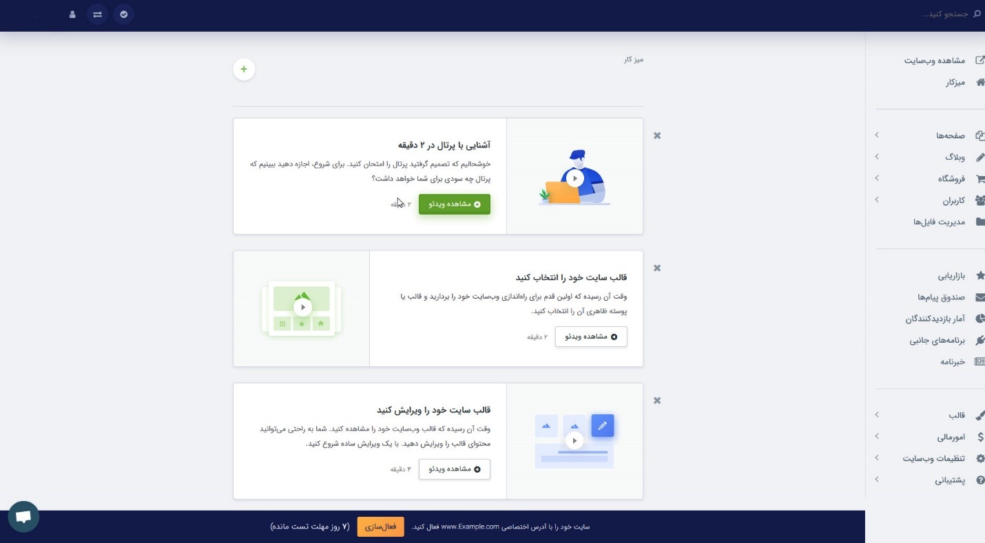 با کلیک روی آن، اولین گام تا ایجاد سایت را برداشتهاید. سایت فروشگاهی میخواهید؟ سایت شرکتی میخواهید یا اصلا یک سایت شخصی؟ هر کدام را که میخواهید انتخاب کنید. نگران ادامه کار نباشید؛ چون با چند ویدئوی کوتاه مو به مو به شما گفته میشود باید چه کار کنید. بدون اینکه نیاز باشد، گزینهای را انتخاب کنید، نقشه راه دقیقا جلوی رویتان قرار میگیرد. حتی اگر باز هم سؤالی برایتان پیش آمد، هم میتوانید با شماره ۰۲۱۶۳۴۰۴ داخلی ۲ تماس بگیرید، هم درخواست پشتیبانی دهید. خلاصه اینکه دیگر نیازی نیست چیزی اضافه کنیم؛ فقط خودتان ببینید! تصویر زیر بخشی از صفحه اصلی سایتتان است.