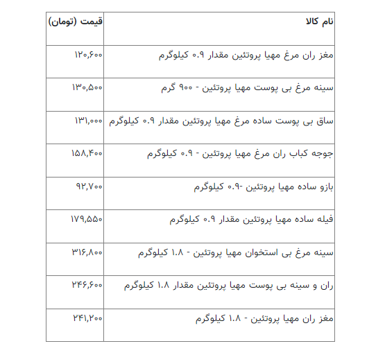 فهرست قیمت برخی از انواع گوشت مرغ بسته بندی موجود در بازار به شرح زیر است.