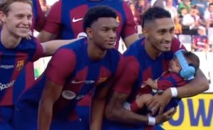 رافینیا، ستاره برزیلی بارسلونا، که ۱۶ اردیبهشت امسال برای اولین بار پدر شد، امروز در اولین بازی رسمی فصل، پسر ۴ ماهه خود را به ورزشگاه المپیک کمپانی لوییس آورد تا اولین قهرمانی‌اش بعد از پدر شدن را با او جشن بگیرد.