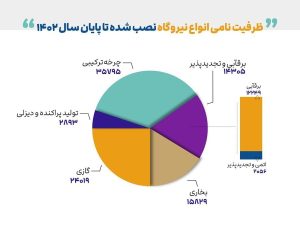 بعد از نیروگاههای سیکل ترکیبی، نیروگاههای گازی با ۲۴۰۱۹ مگاوات، نیروگاههای بخاری با ۱۵۸۲۹ مگاوات، نیروگاههای تجدیدپذیر با ۱۴۳۰۵ مگاوات و نیروگاههای برقآبی با ۱۲۲۴۹ مگاوات، به ترتیب بیشترین سهم را تا پایان سال ۱۴۰۲ داشتهاند.