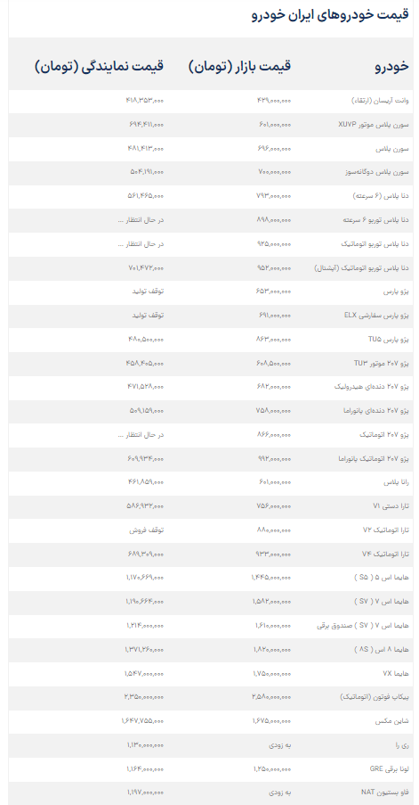 به گزارش آوای اقتصاد; برای مشاهده قیمتهای بازار و قیمتهای نمایندگی خودروهای ایران خودرو در تاریخ پنجشنبه، اول شهریور ۱۴۰۳، به جدول زیر مراجعه کنید. توجه داشته باشید که این قیمتها به تومان بوده و بهطور روزانه بهروزرسانی میشود.