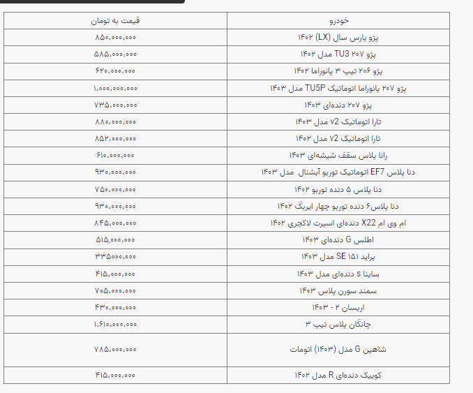 به گزارش آوای اقتصاد; قیمت خودرو در بازار آزاد امروز دوشنبه ۱۹ شهریور ماه بر اساس معاملات انجام شده نسبت به آخرین معاملات روزهای گذشته به شرح زیر است: