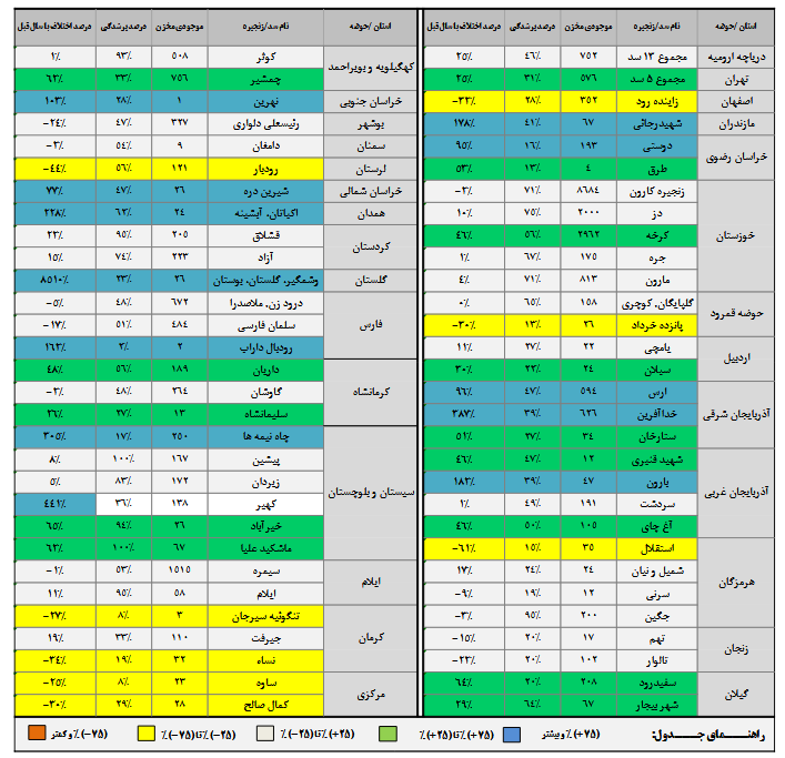 حجم آب موجود در مخازن در حال حاضر ۲۷.۱۴ میلیارد مترمکعب است که نسبت به ۲۴.۳۲ میلیارد مترمکعب سال گذشته، ۱۲ درصد رشد نشان میدهد. درصد پرشدگی سدهای کشور تا تاریخ مذکور نیز ۵۲ درصد گزارش شده است.